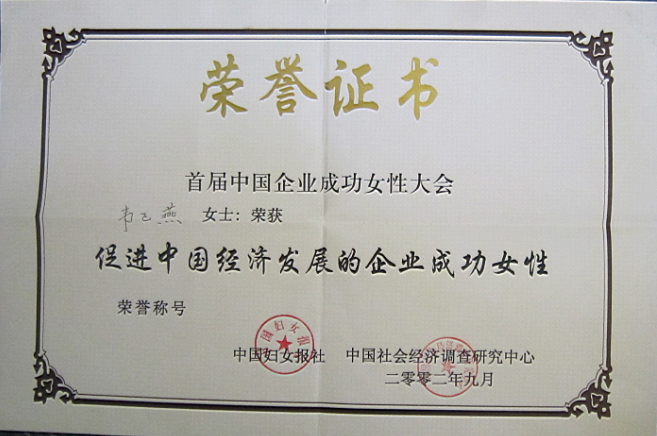 2002/09:韋飛燕廠長(zhǎng)獲得“促進(jìn)中國(guó)經(jīng)濟(jì)發(fā)展的企業(yè)成功女性”稱(chēng)號(hào)。
