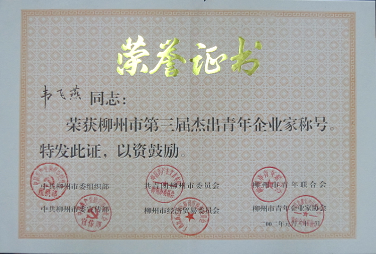 2002/01:韋飛燕廠長(zhǎng)獲得“廣西十大杰出青年企業(yè)家”稱(chēng)號(hào)。